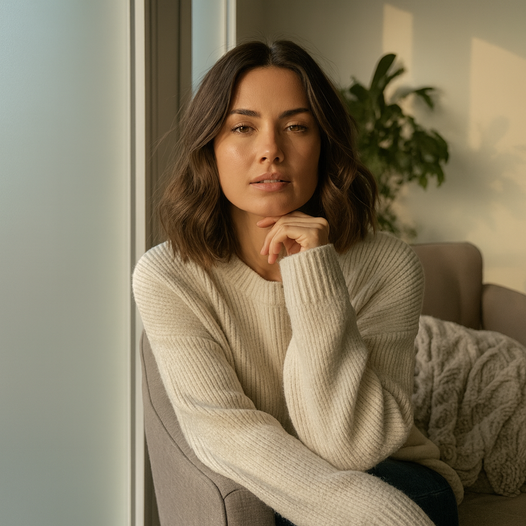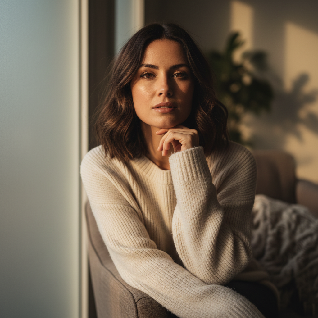 Moody creative portrait of a woman with soft dark lighting, minimal makeup, ethereal shadows, fantasy-inspired yet natural look, muted background, subtle cinematic color palette.